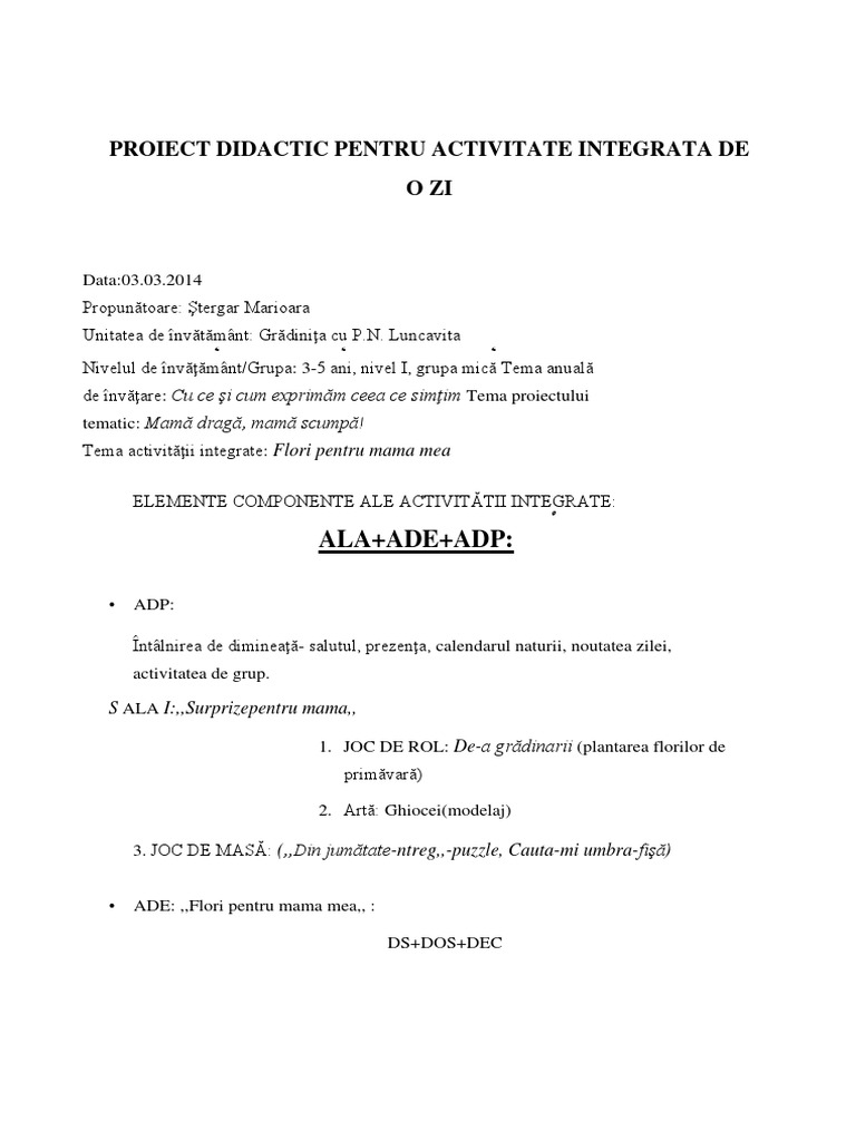 Proiect Didactic Pentru Activitate Integrata De O Zi